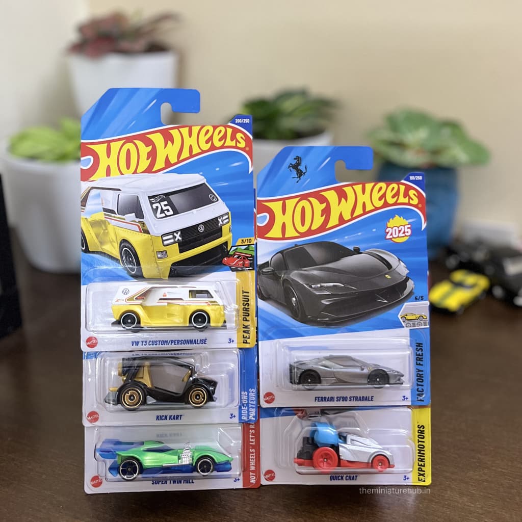 This combo features a diverse lineup: the elegant Ferrari SF90 Stradale (Factory Fresh), rugged VW T3 Custom (Peak Pursuit), tech-inspired Quick Chat (Experimotors), playful Kick Kart (Ride Ons), and the dynamic Super Twin Mill (Let’s Race). Together, they deliver variety, detail, and value in a single collectible pack.
