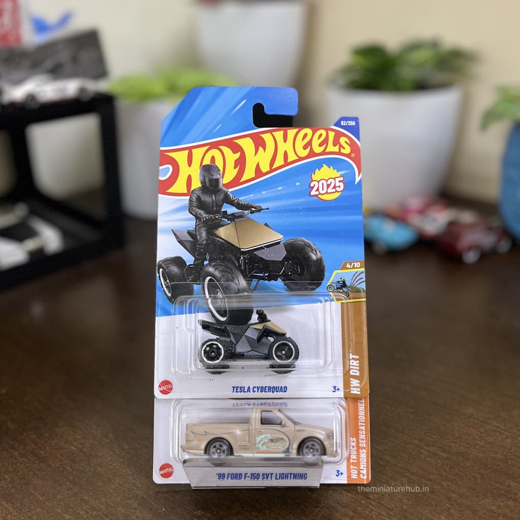 The Hot Wheels Tesla Cyberquad & ’99 Ford F-150 SVT Lightning (Pack of 2) is a thrilling combo for collectors and kids alike, combining futuristic and classic truck designs.